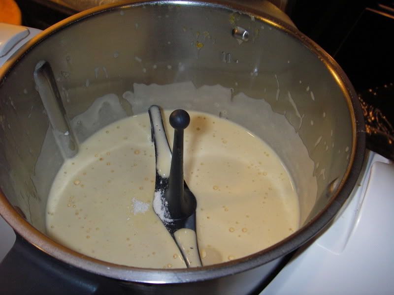 Coloque o suporte giratório nas lâminas, junte os ovos e as gemas e o açucar no copo e programe 4 minutos a 40º C velocidade 3. Quando o tempo terminar junte a água , tire a temperatura e programe 5 min., na velocidade 3.
