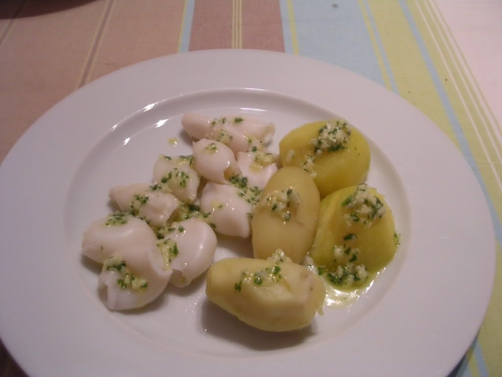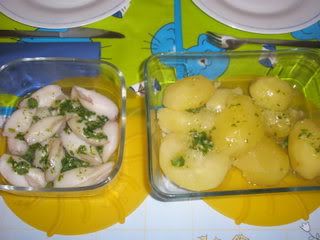 Coloca-se um litro de água com sal o copo. Põem-se as batatas no cesto e as lulas na Varoma e programa-se 30 minutos, tem. varoma, vel. 2.