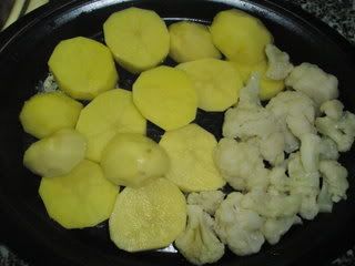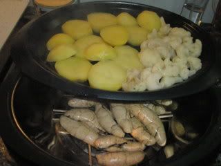 No tabuleiro superior as batatas e os legumes. os meus foram couve flor.Colocar agua no copo e 45m temp varoma, veloc 2