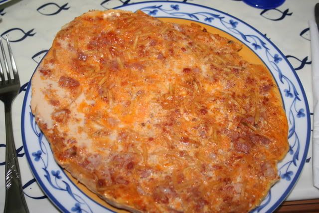 Piquei linguiça e deixei inteiros bacon em tiras e batata palha. Hipercalórica mas deliciosa. Só tive pena que levasse cerca de 40 minutos a cozinhar mas acho que valeu bem a pena. O esquisito cá de casa aprovou...