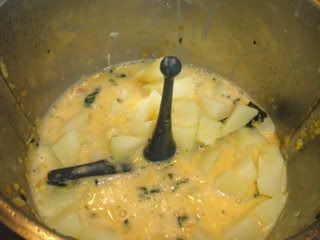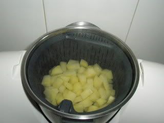 Cortar as batatas aos cubos e colocar no cestos. Deitar agua no copo, colocar o cesto e cozer as batatas 10 a 12m temp varoma, veloc 4. Reservar.