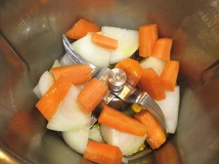 Deitar a cebolha, o alho, a cenoura e programar uns seg, veloc 5. Juntar o azeite e refogar 12m, temp 100º
