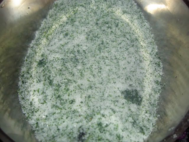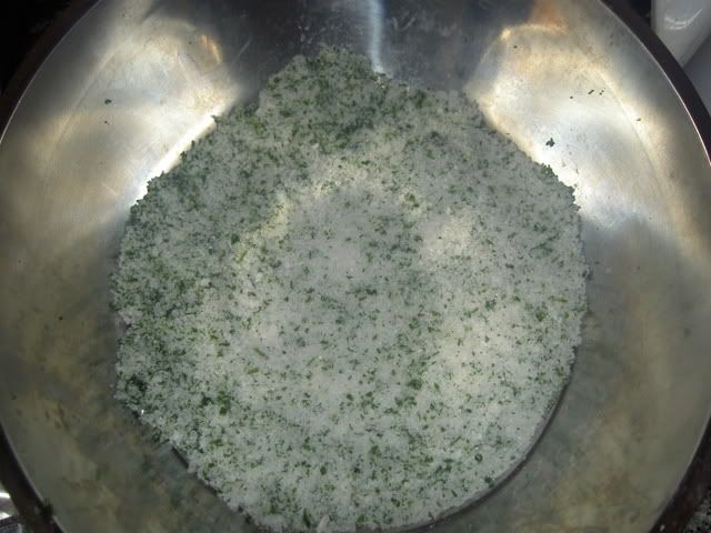 Primeiro triturei salsa. Depois juntei com o sal e 2 claras de ovo.